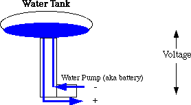 Voltage (V) is the same thing as water pressure: a higher voltage pushes the charges through the wire with greater force. Think of a water tower, with water stored in a tank at the top. The higher the tower, the stronger the water pressure at the bottom of the tower.